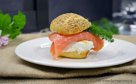Per la ricetta di oggi abbiamo utilizzato il nostro pane al sesamo da 25 g. Lo abbiamo farcito con robiola e salmone. Scopri tutti gli ingredienti e la ricetta completa.